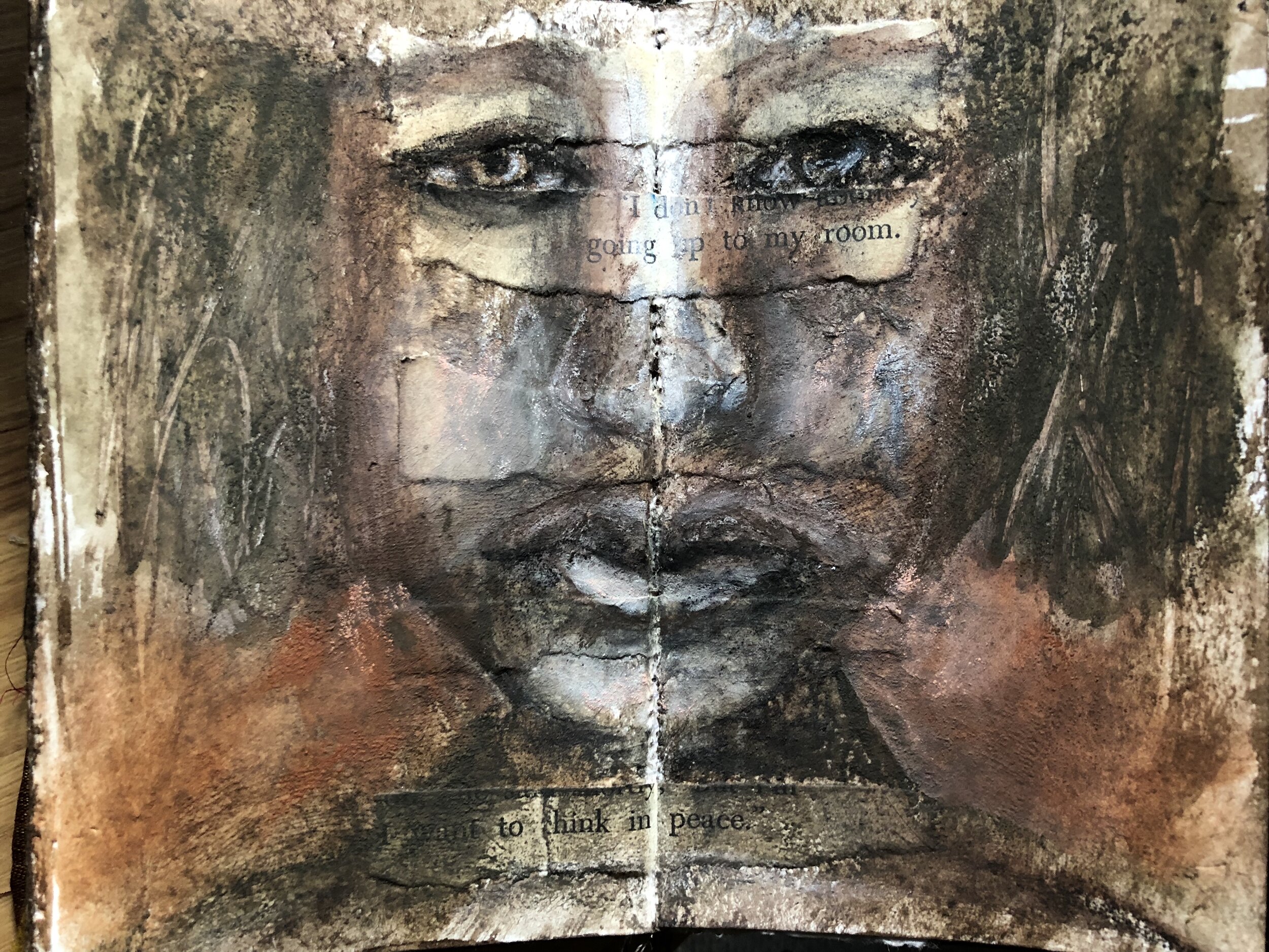 My tiny travel journal had pages that got roughed up on the journey and were falling out. So I tore some old book pages and laid them across the seam, wabi sabi style. This made for great texture under the "painting" that I did next with Neocolor II crayons, Stabilo All and a waterbrush.